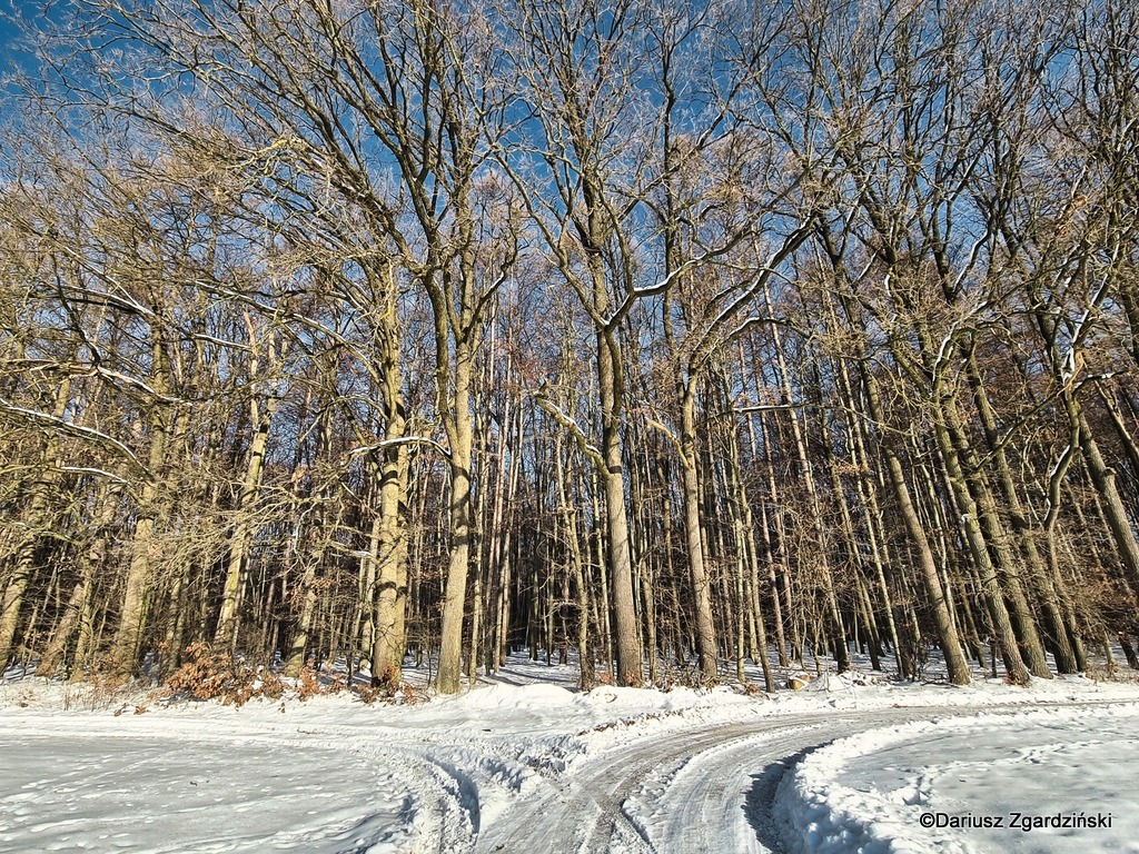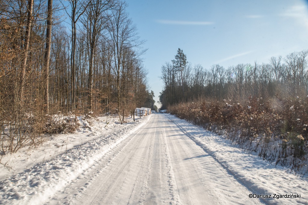 Trakt prowadził do samego Gościeradowa, był odśnieżony, biegł idealnie prosto i nie było widać jego końca. Postanowiłem pójść około kilometra tym oblodzonym szlakiem. Lód pękał pod nogami z dźwiękiem tłuczonego szkła. Nad drogą ukazały się nagle srebrnoszare skrzydła jastrzębia. Gwizdnąłem na niego, żeby zawrócił i zapozował do zdjęcia ale odleciał ponad dachem boru znikając po kilku sekundach. Skręciłem w lewo, w stronę Księżomierzy, wchodząc ponownie na pokrytą śniegiem przesiekę. Byłem w gospodarczej części lasu, gdzie fragmenty starodrzewu przeplatały się z młodnikami.