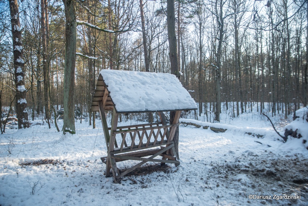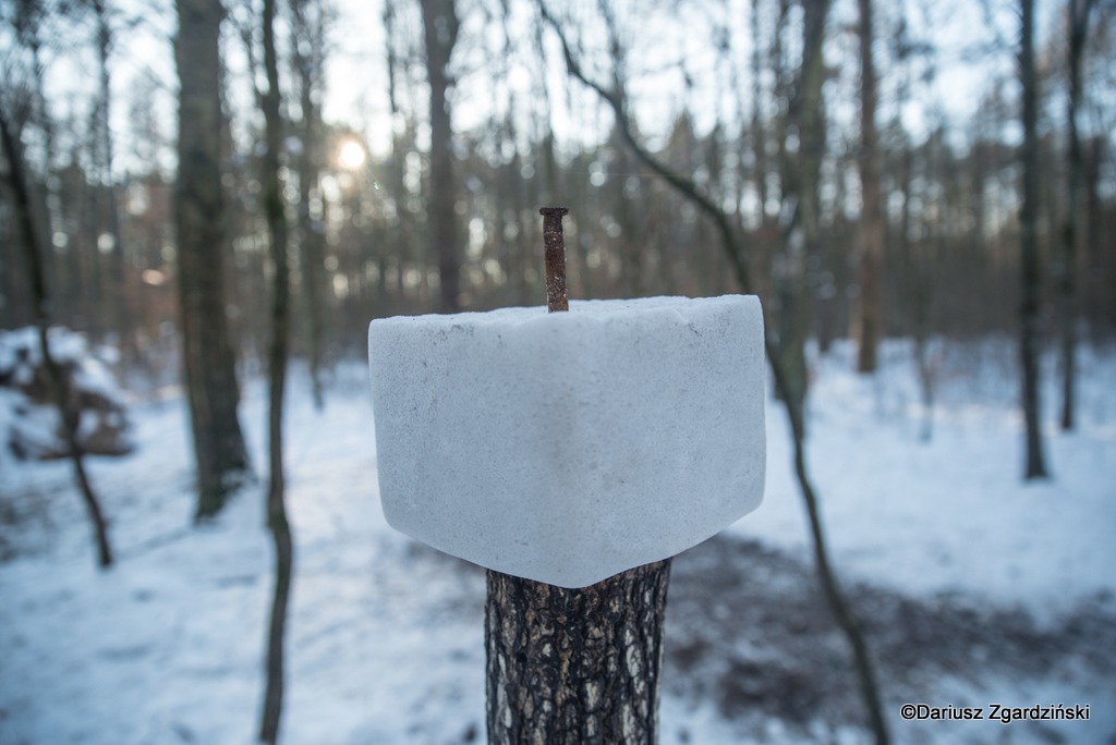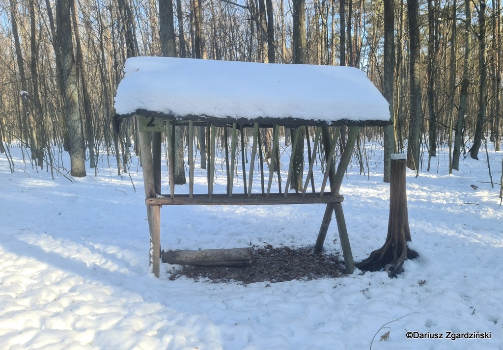 Po sprawdzeniu czasu postanowiłem skierować swoje kroki w stronę śródleśnego stawu. Nie trafiłbym do niego bez aplikacji, w której mogłem iść po ścieżce sprzed roku, kiedy byłem przy nim poprzednio. Okazało się również, że poprowadzą mnie do niego też ślady męskich butów. O ile łatwiej się szło przez zaspy korzystając z odcisków cudzych stóp. Był to najprawdopodobniej myśliwy z annopolskiego Koła Zaborze, który przyniósł w znajdujące się przy jeziorku miejsce dokarmiania zwierząt solną lizawkę. Jest to blok soli dla zwierząt, często wzbogacony o minerały, który służy do uzupełniania niezbędnych składników odżywczych, przede wszystkim sodu, chloru, a także mikroelementów, wspierając ich zdrowie, kondycję i przemianę materii, szczególnie w okresach niedoborów pokarmowych, a zima jest właśnie takim okresem.