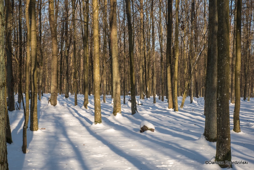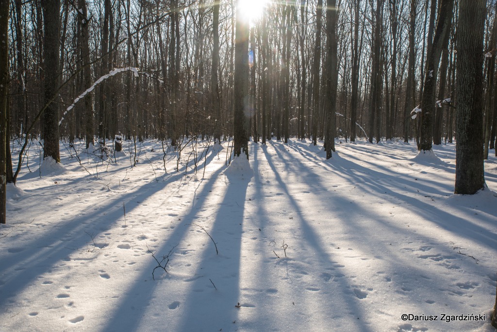 Las był całkowicie cichy i pięknie srebrzył się śniegiem w stojącym w zenicie słońcu. Dąbrowa jest z definicji lasem jasnym i tak właśnie tutaj jest, tym bardziej o tej porze roku, kiedy z drzew opadły wszystkie liście. W borach iglastych korony sosen nie wpuszczają niżej aż tyle światła.