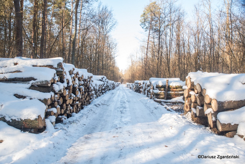Po niespełna półtorej godziny wędrówki wyszedłem na drogę przeciwpożarową. Oba jej brzegi zastawione były poukładanymi belami ściętych drzew przeznaczonych do wywózki. Dąbrowa jest lasem o charakterze przyrodniczym ale gospodarka leśna rządzi się swoimi prawami. Wzdłuż śródleśnego traktu leżały tony opisanych i oznakowanych buków i sosen.