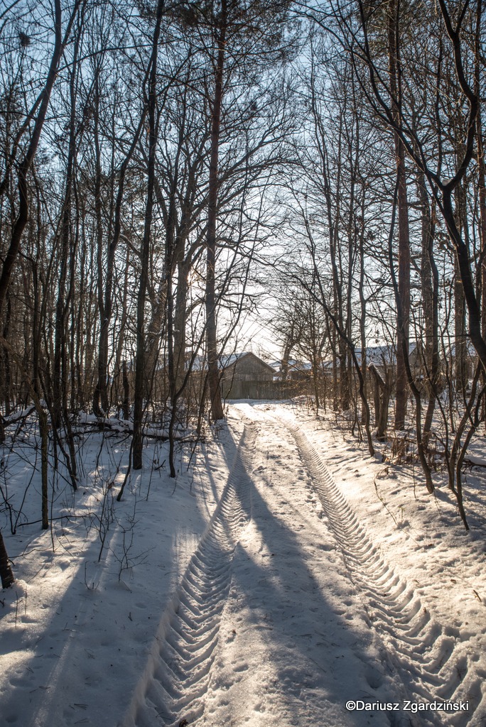 Przede mną rysowały się zabudowania kolejnej, przylegającej do lasu posesji, ale zobaczyłem dukt biegnący w głąb boru, postanowiłem więc od razu się tam zapuścić. Pierwsze kroki po głębokim, stwardniałym z wierzchu śniegu zdawały się mówić: to nie będzie lekki spacer. Ciało od razu poczuło ciężar plecaka i własnych nóg. Dopiero po chwili, kiedy uwolniona z kawy kofeina rozeszła się po krwioobiegu, przestałem odczuwać dyskomfort marszu i mogłem wsłuchiwać się w przyjemny chrzęst zmrożonej śnieżnej powały pękającej pod każdym stąpnięciem.