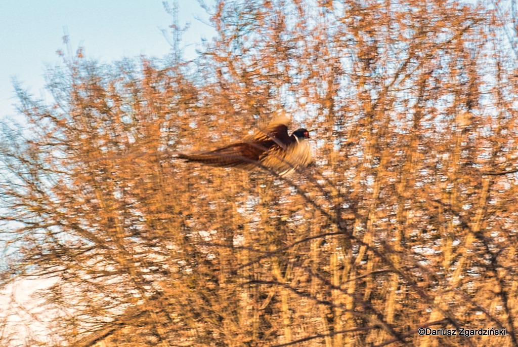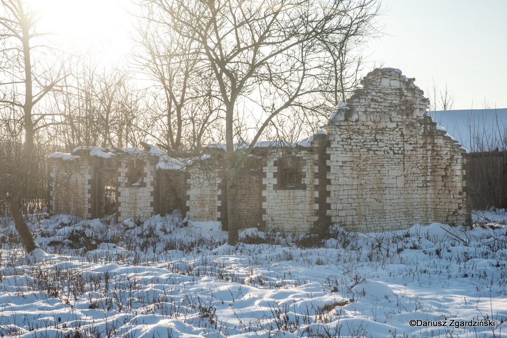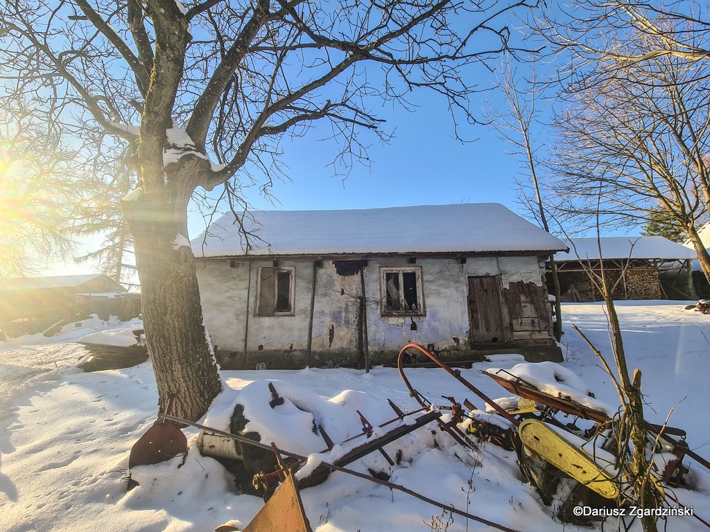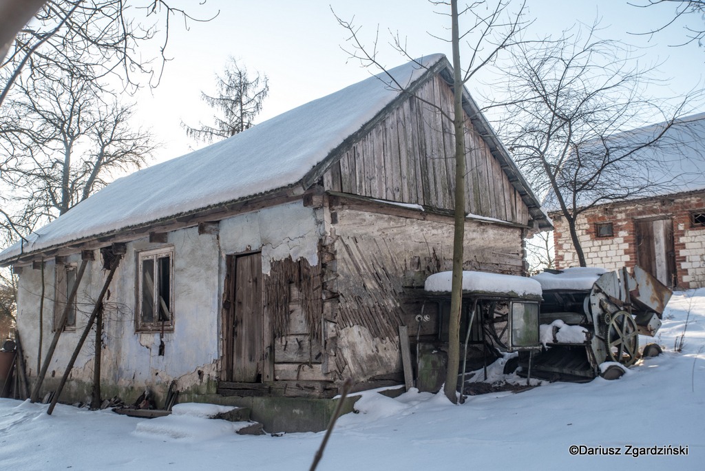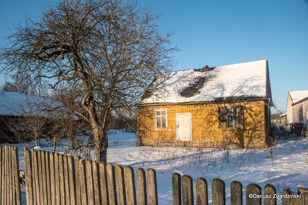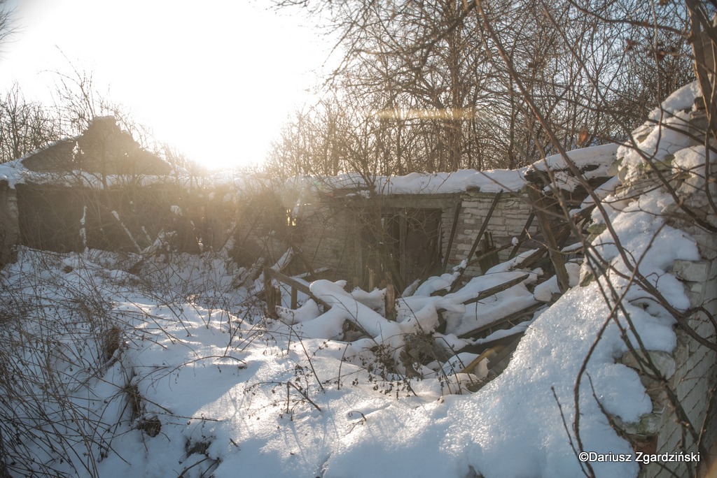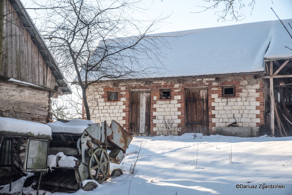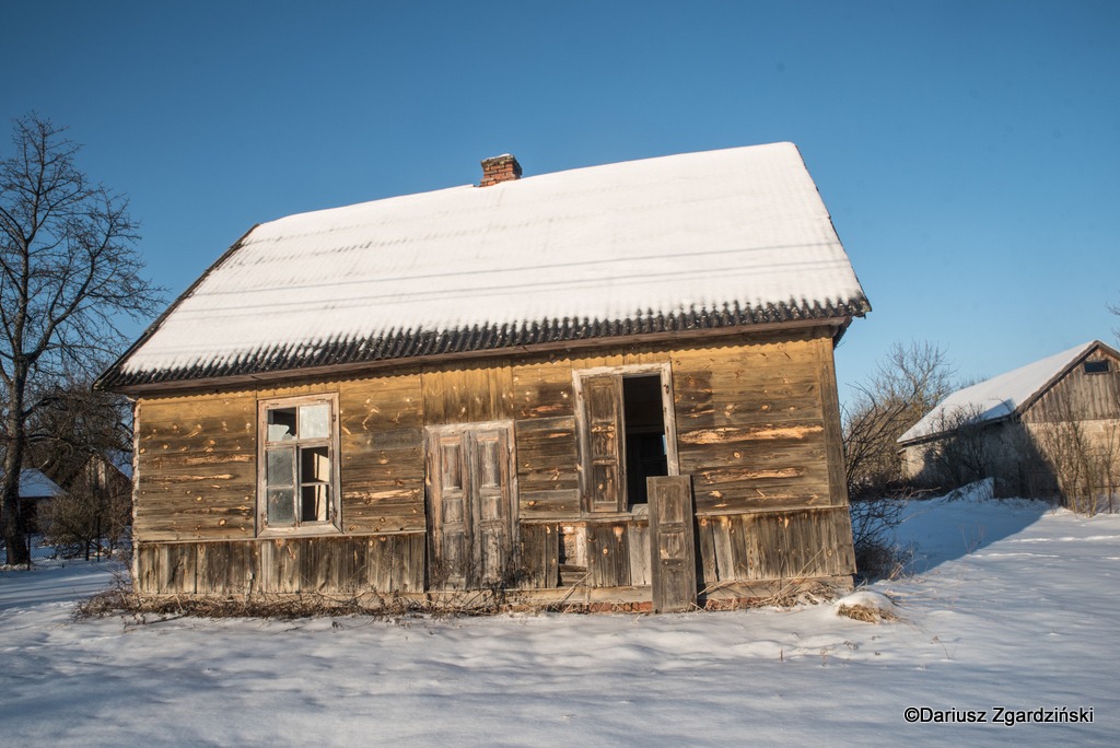 Tak oto, po dziewięciu kilometrach mroźnego rajdu dotarłem do skraju lasu, który wyznacza granicę gmin. Idąc przez wieś obserwowałem jak opuszczone chaty i całe gospodarstwa przeplatają się z zamieszkałymi. Zajrzałem do kilku z tych pustych, stojących blisko szosy. Niektóre z nich to już wyłącznie ruiny, inne udałoby się jeszcze uratować. Z porośniętych krzewami pozostałości domu wystrzelił w górę z krzykiem kolorowy kogut bażanta.