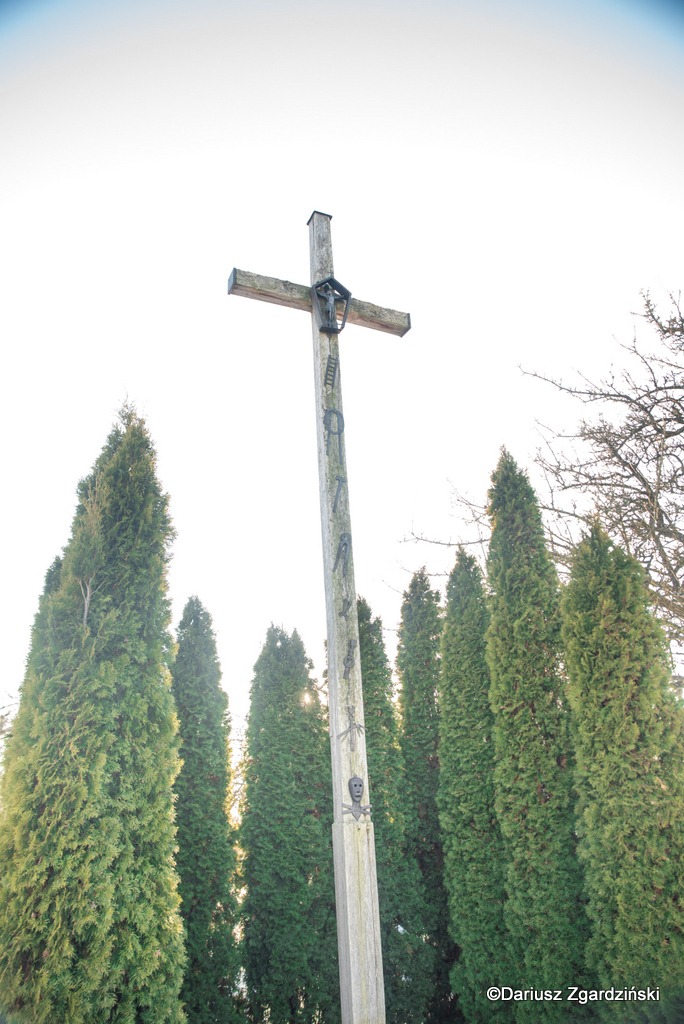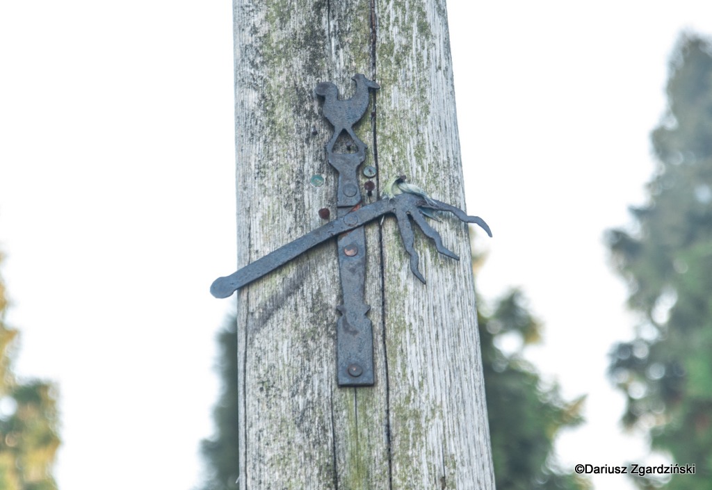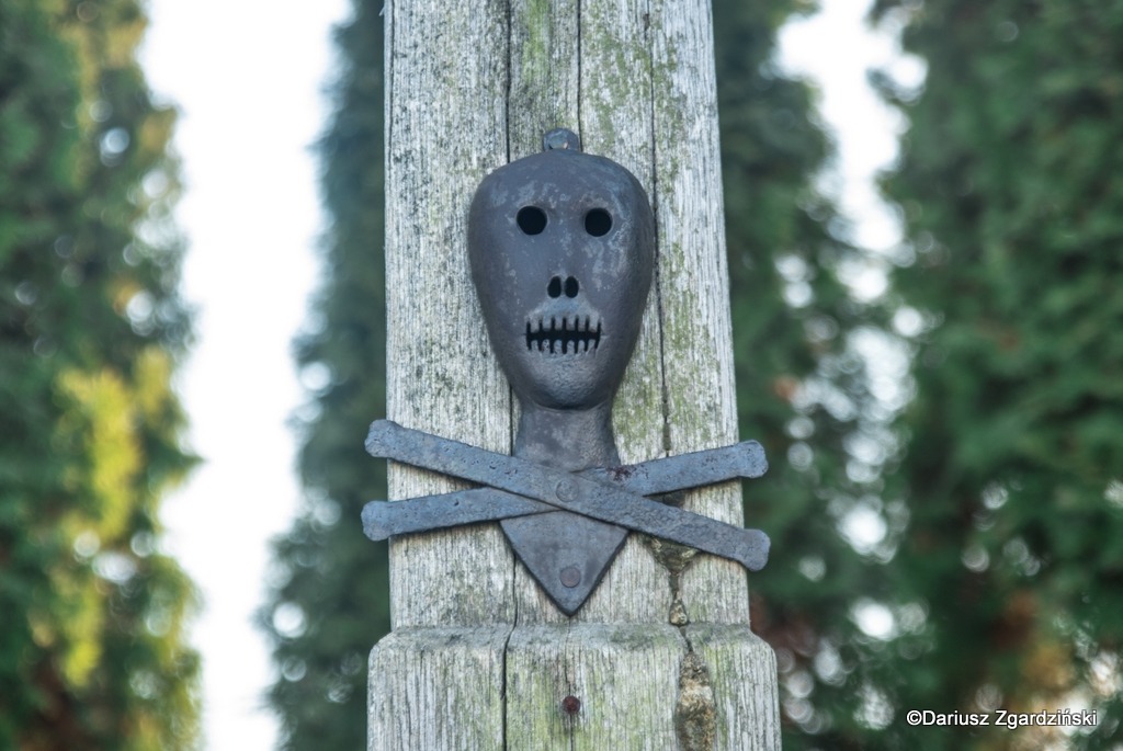 Moją wędrówkę zakończyłem przy starym krzyżu „Arma Christi”. Dosłownie termin ten oznacza „oręż” albo „broń” Chrystusa. Tłumaczy się go także jako „Narzędzia męki”. Do drewnianego krzyża przybite są różne, metalowe artefakty: młotek, gwoździe, nożyce, a na samym dole widnieje upiorna, wykuta przez kowala trupia czaszka symbolizująca Golgotę (Miejsce Czaszki), gdzie ukrzyżowano Chrystusa. Nazywana jest również Czaszką Adama, według Biblii pierwszego człowieka. Wyobraźnia i umiejętności ludowego zapewne artysty sprawiła, że patrząc na nią bliżej do skojarzeń z „Człowiekiem w żelaznej masce” niż konkluzji natury teologicznej.
